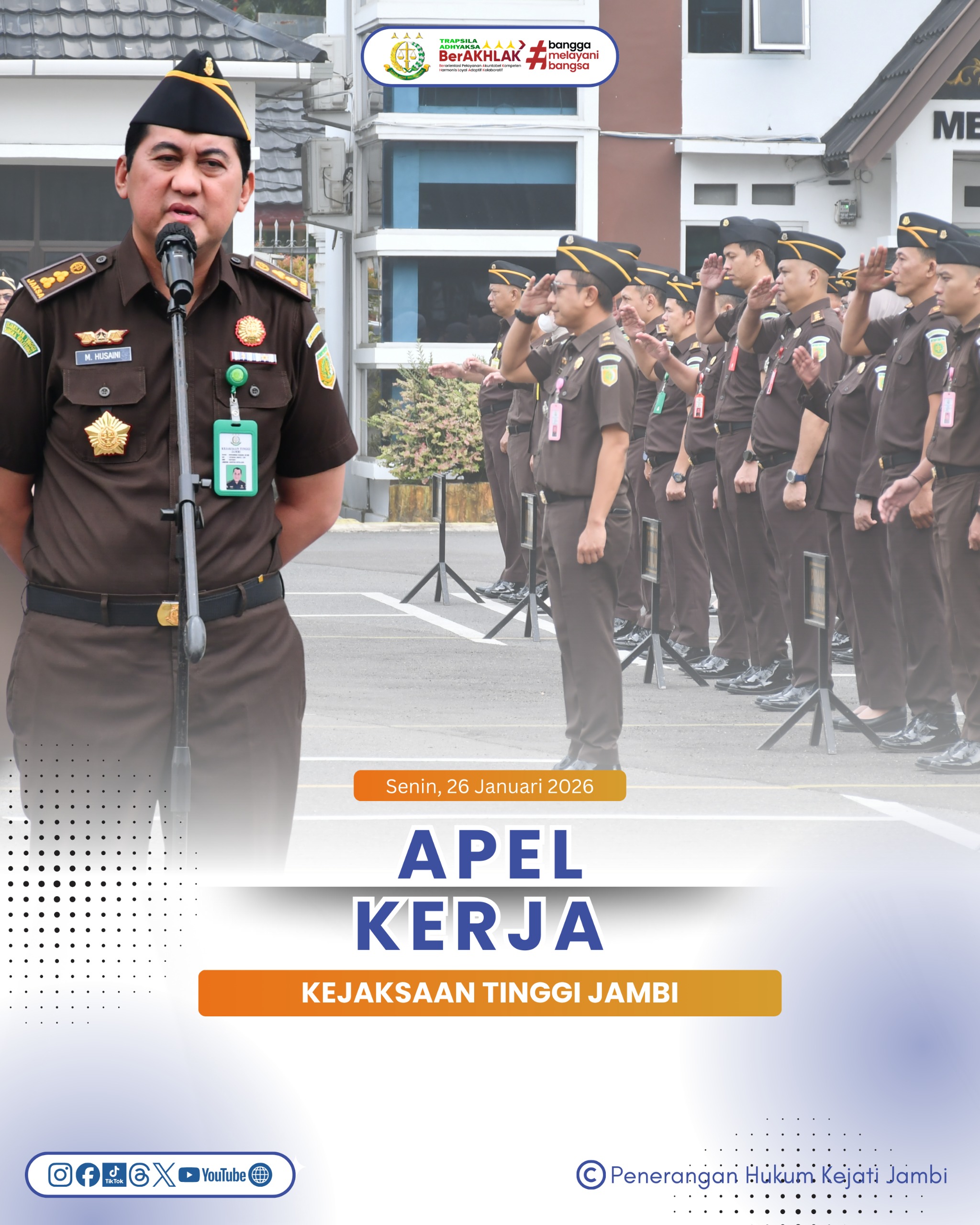 Kejaksaan Tinggi Jambi melaksanakan apel pagi rutin yang diikuti oleh seluruh pegawai pada Senin (26/01/2026) bertempat di halaman Kantor Kejaksaan Tinggi Jambi.