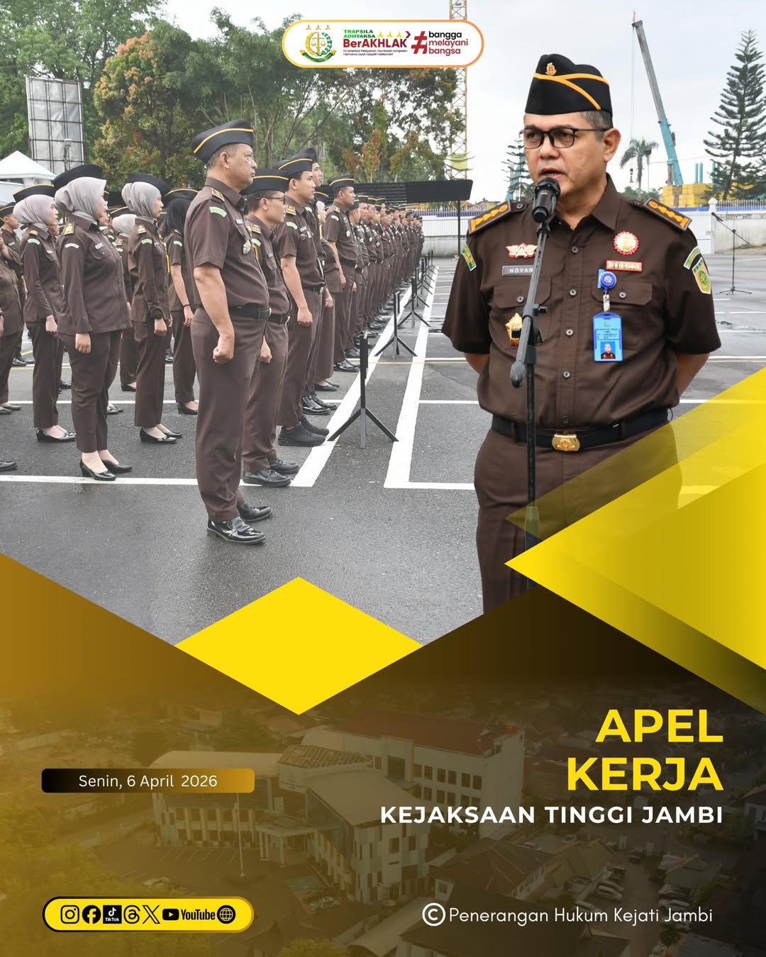 Kejaksaan Tinggi Jambi melaksanakan apel pagi rutin yang diikuti oleh seluruh pegawai pada Senin (06/04/2026) bertempat di halaman Kantor Kejaksaan Tinggi Jambi.
