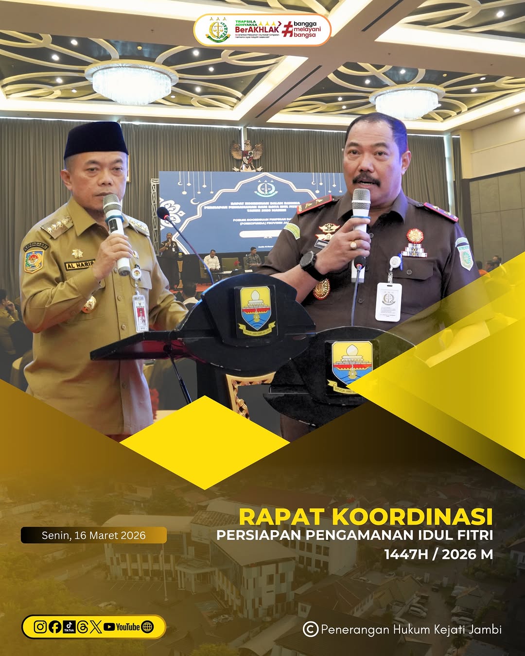 Dalam rangka persiapan pengamanan Hari Raya Idul Fitri 1447 H / 2026 M, Kepala Kejaksaan Tinggi Jambi Sugeng Hariadi, SH., MH. menghadiri Rapat Koordinasi bersama Forum Koordinasi Pimpinan Daerah (Forkopimda) Provinsi Jambi yang dilaksanakan pada Senin (16/3/2026).