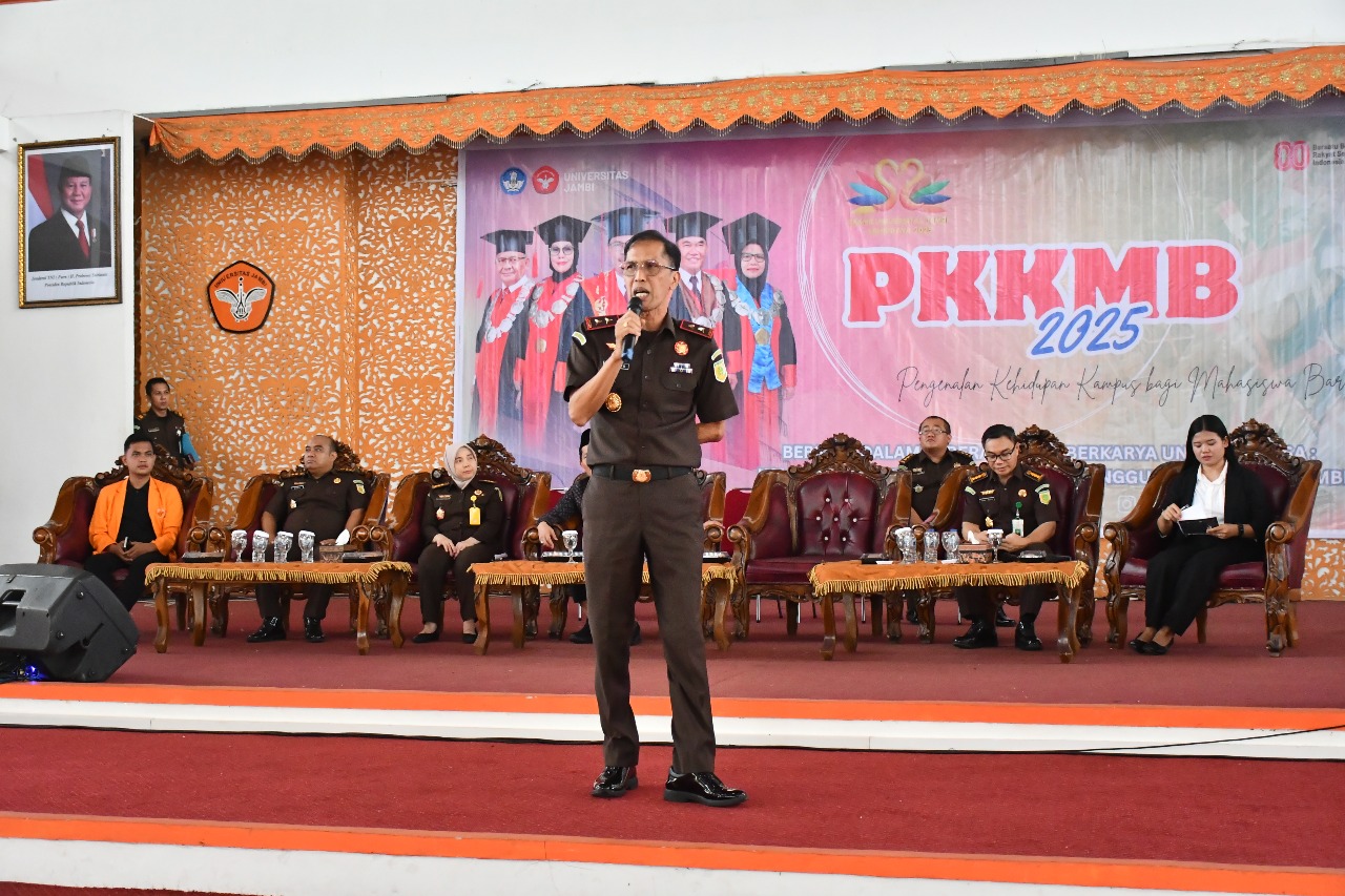 Kepala Kejaksaan Tinggi Jambi Dr. Hermon Dekristo,SH.,MH menjadi narasumber dalam kegiatan penyuluhan hukum yang bertepatan dengan acara PKKMB dengan tema “Bersatu dalam Keberagaman, Berdaya untuk Bangsa, Kolaborasi dalam Mewujudkan Generasi Unggul Universitas Jambi” pada Selasa (12/08/2025) di Balairung Universitas Jambi.