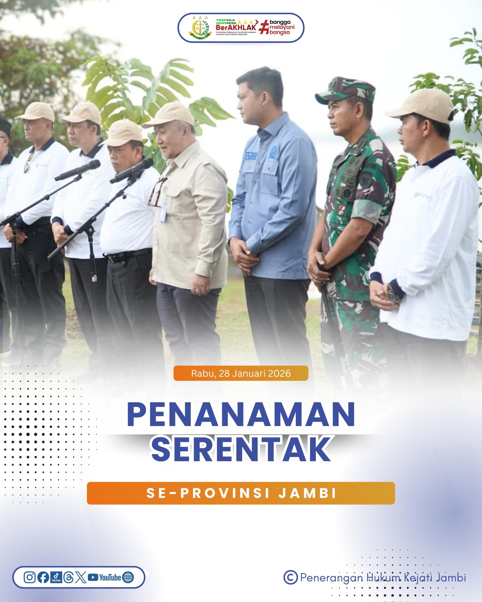 Dalam rangka pencegahan bencana hidrometeorologi dan pemulihan lingkungan, Kepala Kejaksaan Tinggi Jambi yang diwakili oleh Kasi II Bidang Intelijen, Ridwan Joni, S.H., M.H., menghadiri kegiatan Penanaman Serentak se-Provinsi Jambi yang bertempat di sempadan Sungai Batang Hari, Dusun Tuo, Desa Pematang Jering, Kabupaten Muaro Jambi pada Rabu (28/01/2026).