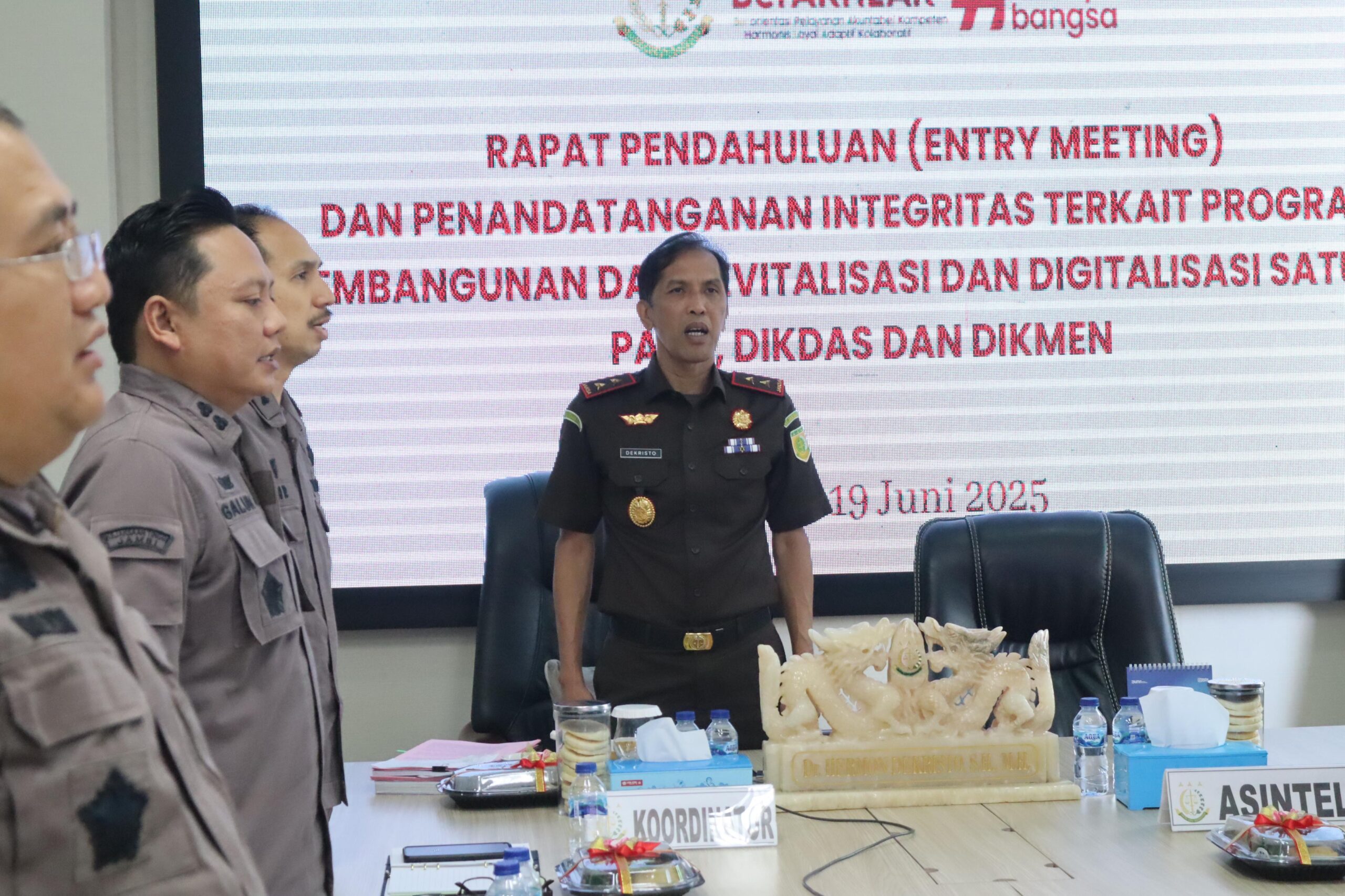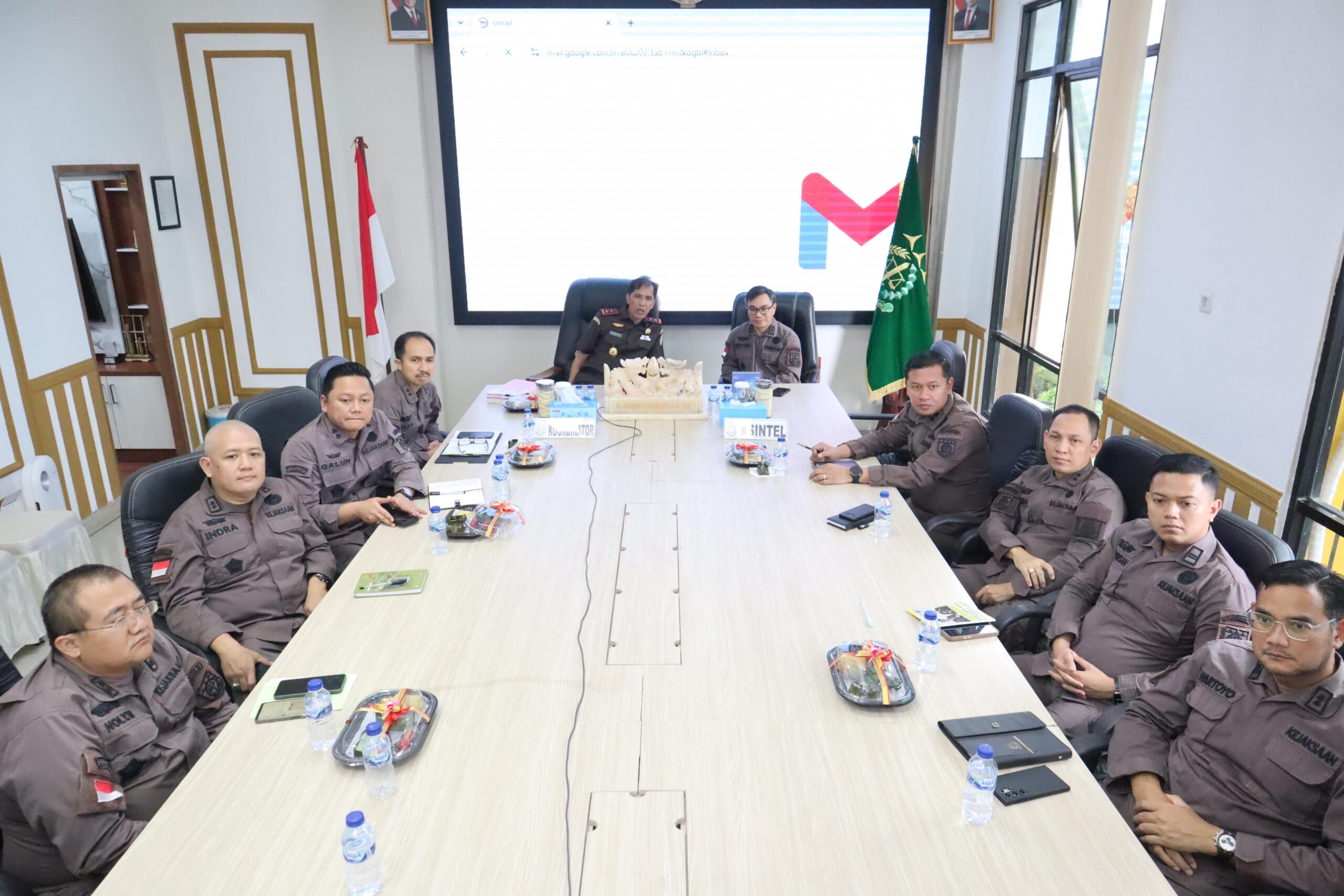 Kepala Kejaksaan Tinggi Jambi Dr. Hermon Dekristo,SH.,MH didampingi Asisten Inteljen dan para Kasi bidang Intelijen Kejati Jambi mengikuti zoom meeting Rapat Pendahuluan (Entry Meeting) dan Penandatangan Pakta