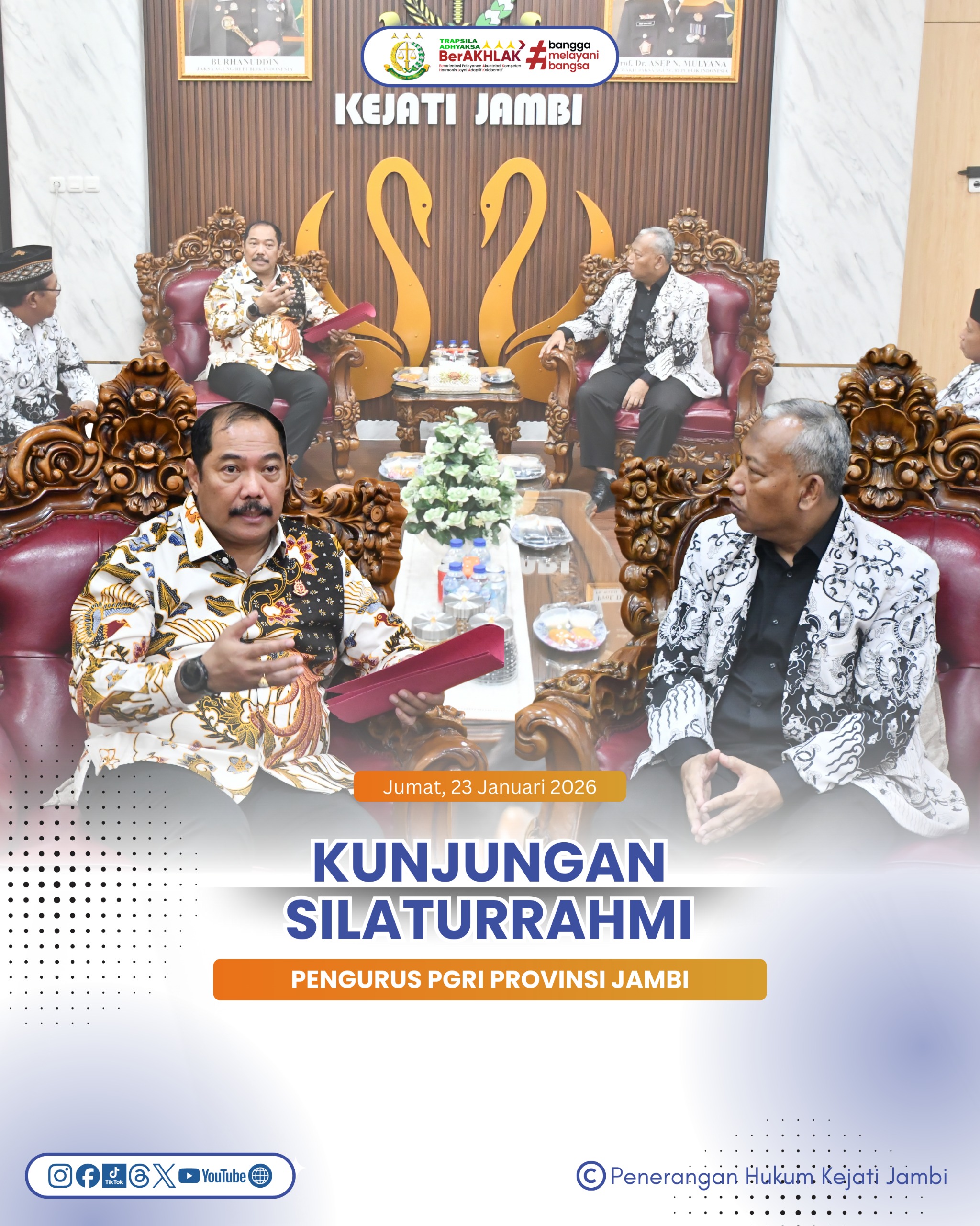Kepala Kejaksaan Tinggi Jambi, Sugeng Hariadi, S.H., M.H., menerima kunjungan silaturahmi dari Pengurus Persatuan Guru Republik Indonesia (PGRI) Provinsi Jambi beserta jajaran pada Jumat (23/01/2026).