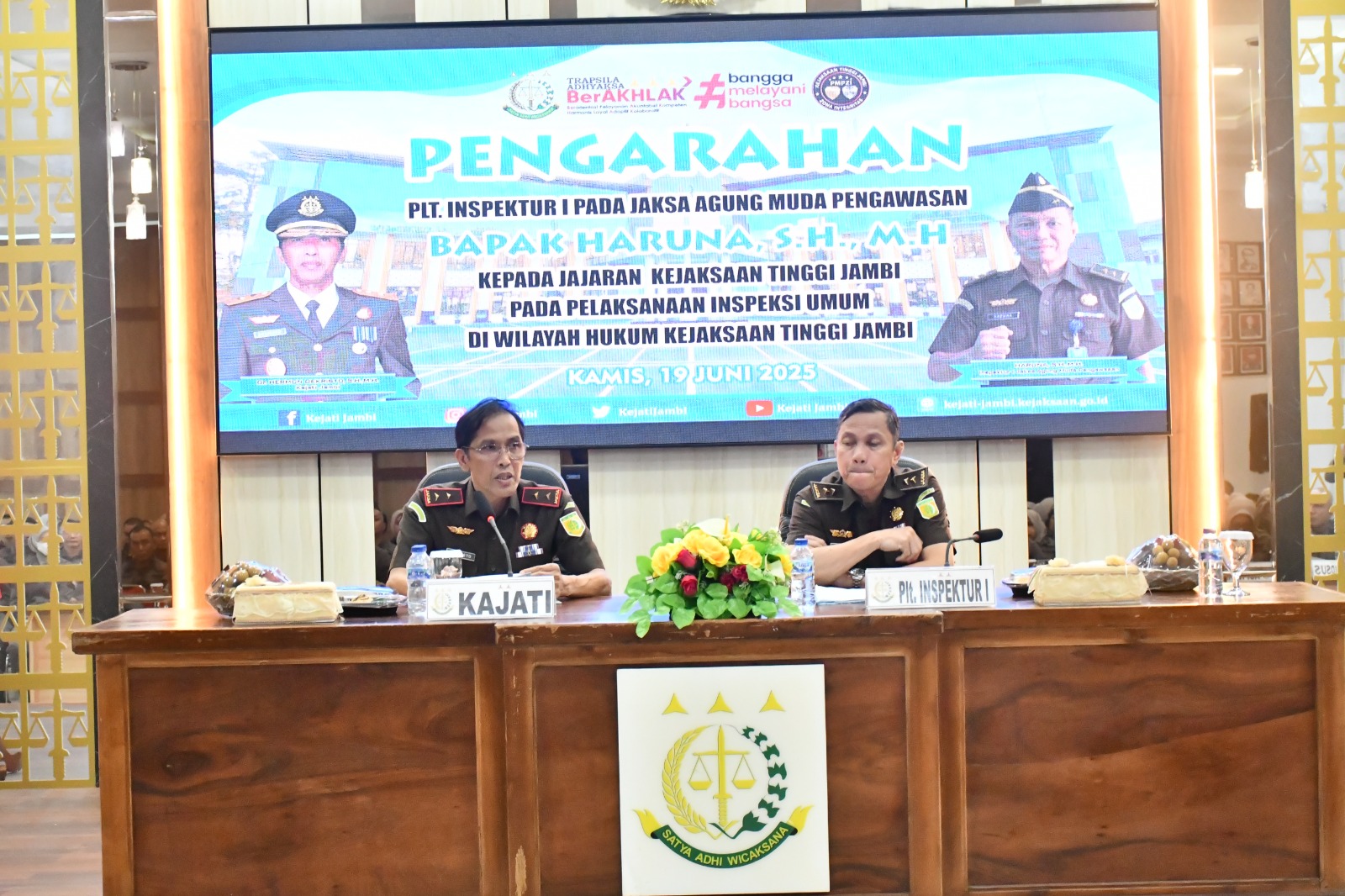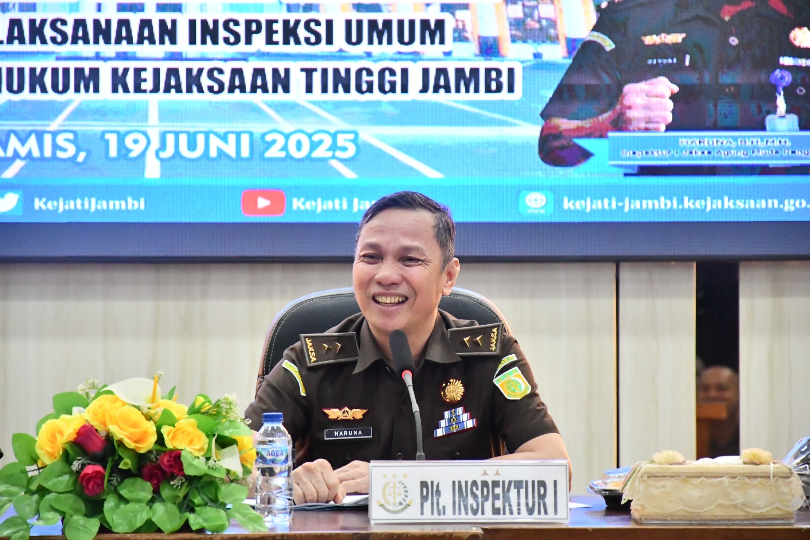 Plt. Inspektur I pada Jaksa Agung Muda bidang Pengawasan Kejaksaan RI Haruna,SH.,MH beserta jajaran melaksanakan Inspeksi umum dan pengarahan kepada jajaran Kejaksaan Tinggi Jambi pada Kamis (20/06/2025).